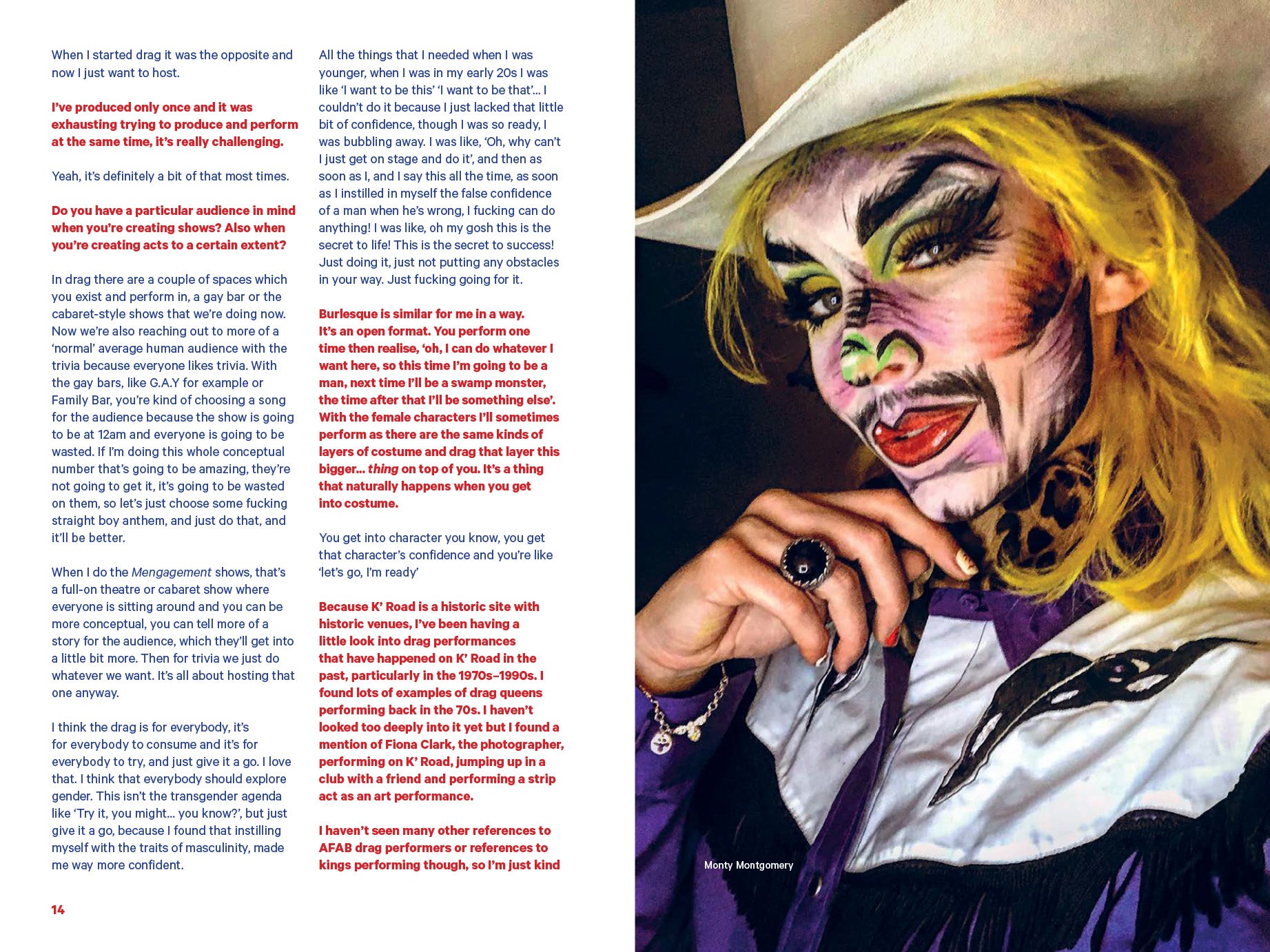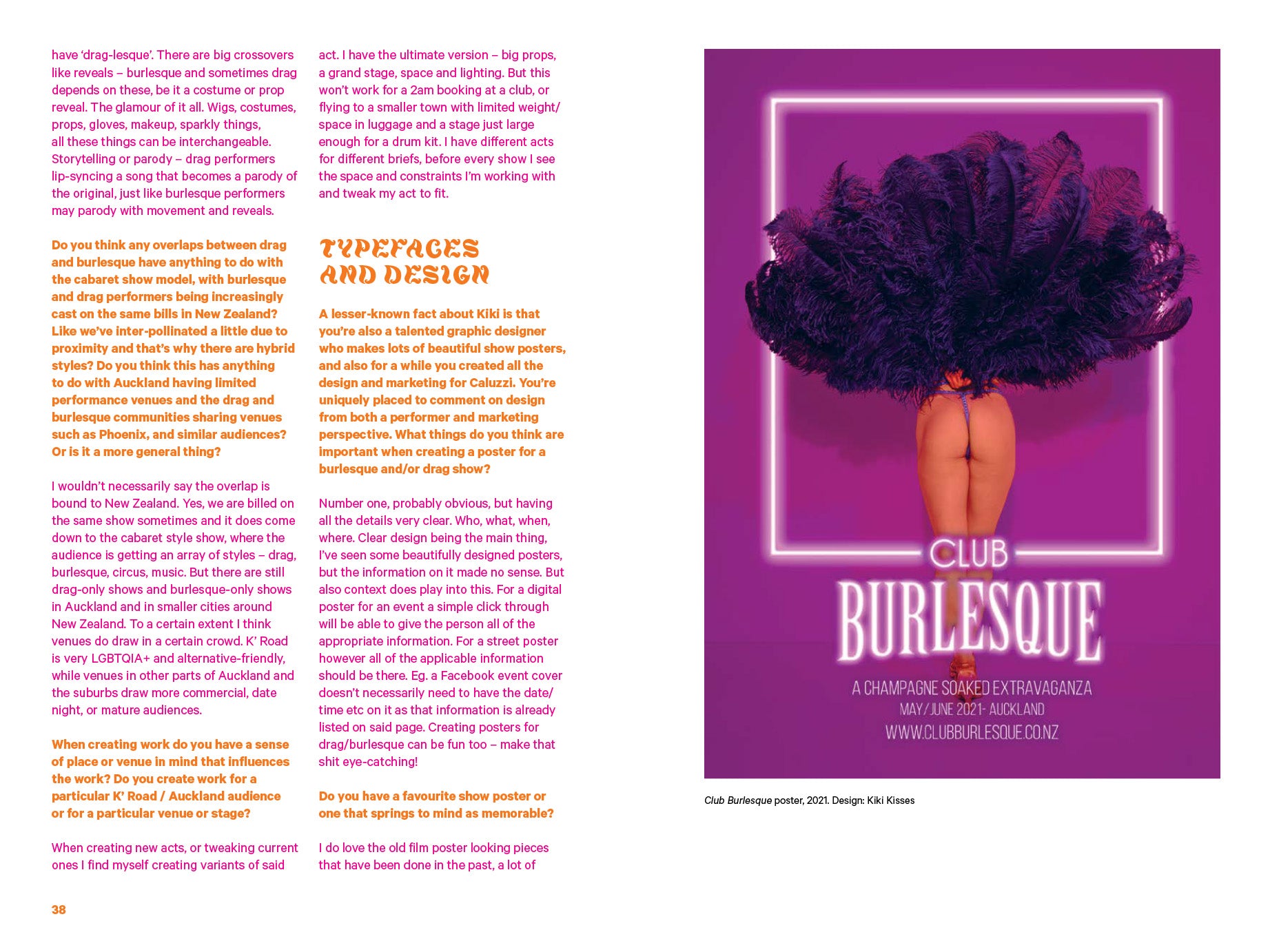 This publication documents my research process that backgrounds the development of the BOUFFONT typeface. The Werkbook consists of a series of interviews undertaken with local drag and burlesque performers about their performance practice, Karangahape Road as a site for performance and culture, and typography in relation to performance on Karangahape Road.